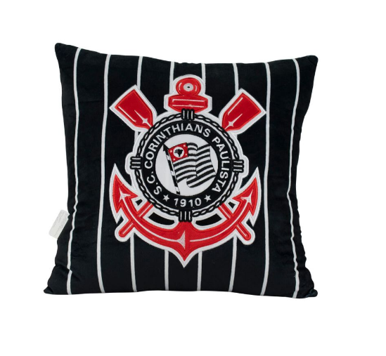 Almofada de pelúcia quadrada com 36 x 36 cm de dimensão, nas cores e costurada com escudo do Corinthians. Material: poliéster; Enchimento: fibra de poliéster