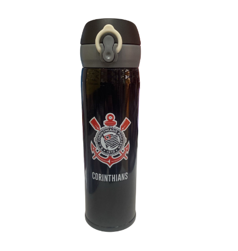 Garrafa térmica de capacidade para 420 ml na cor preta e gravada com brasão do Corinthians. Tampa com trava. Tempo médio de conservação de temperatura até 6 horas. Material: inox