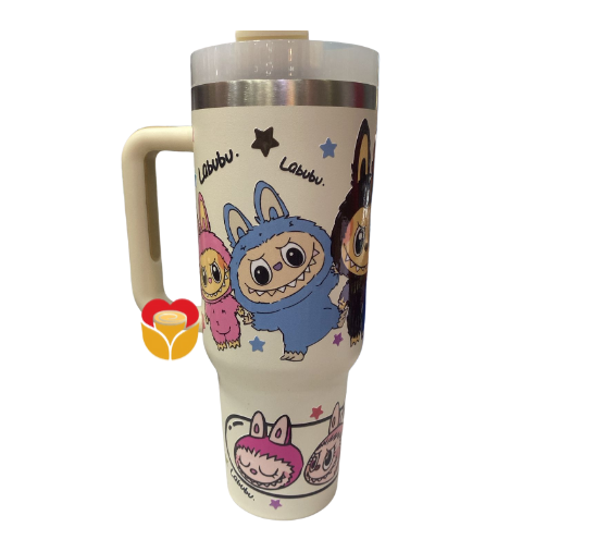 Copo térmico com canudo do personagem Labubu, no copo de fundo branco.