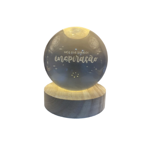 Pequena luminária em formato redondo (em vidro), com base em madeira, com a frase "Seja sua melhor inspiração" no interior do vidro.