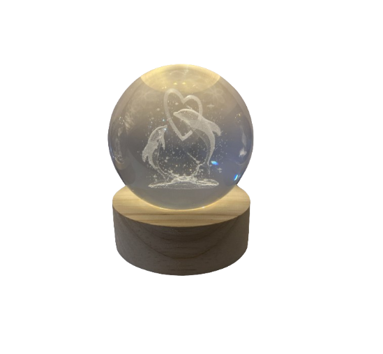 Pequena luminária em formato redondo (em vidro), com base em madeira, com dois golfinhos pulando em um coração no interior do vidro.