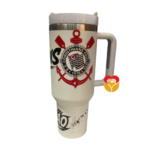 Copo térmico com canudo do Corinthias no copo de fundo branco.
